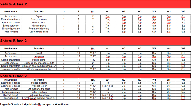 Nella maggior parte degli esercizi il peso di partenza da utilizzare e quello emerso dai test dell’ultima settimana della prima fase, situazione indicata con “t.p” cioè “test precedente”.