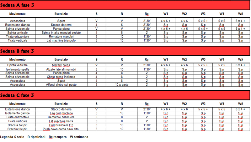 l’ impostazione della scheda rimane quella della fase 2: un primo giorno full body, un secondo giorno con i movimenti di spinta e accosciata e un terzo giorno con i movimenti di estensione d’anca, tirata e braccia.